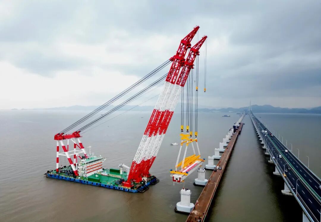 此次架設的鋼梁長107.5米,重約1779噸,加吊具總重2182噸,相當于1500輛家用轎車的重量,橋面至海面最大高度達53米(近20層樓高),鋼梁架設區域毗鄰既有象山港公路大橋,船舶站位緊鄰主航道,往來船只流量大,施工空間狹小、船舶通航密集,對吊裝精度與穩定性提出嚴苛要求。