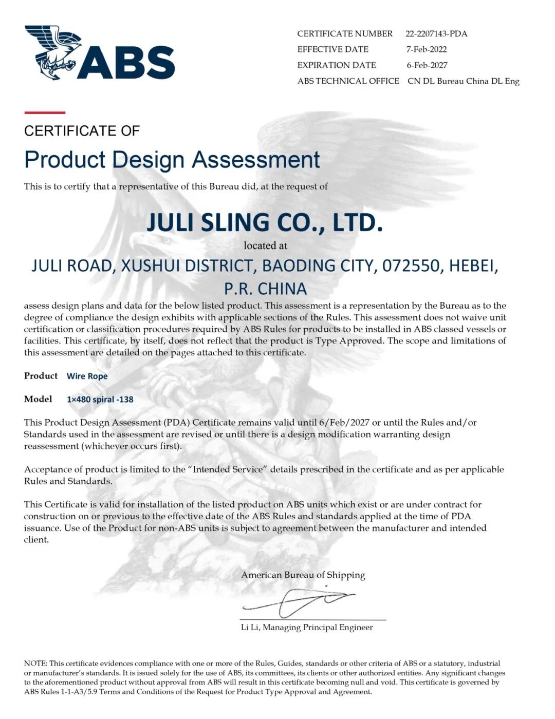 2022年,巨力索具取得美國(guó)船級(jí)社(ABS)單股鋼絲繩ABS設(shè)計(jì)評(píng)估證書,這是巨力索具在深海系泊領(lǐng)域取得的重要資質(zhì)認(rèn)證之一。