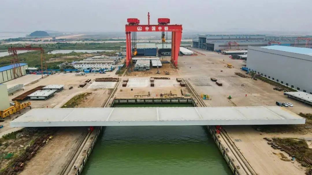 深中通道G05標段泄洪區及淺灘區鋼箱梁大節段XG9L的出海平臺方案為世界首創的出海運輸方案,整個運輸過程使用8臺模塊車,4臺移梁平車,頂升運載能力可達2000噸。經過三次頂升及運輸,將鋼箱梁大節段XG9L從存梁區運至待裝船區,由世界第二起重能力的“天一號”運架一體船將鋼箱梁吊運至橋址。