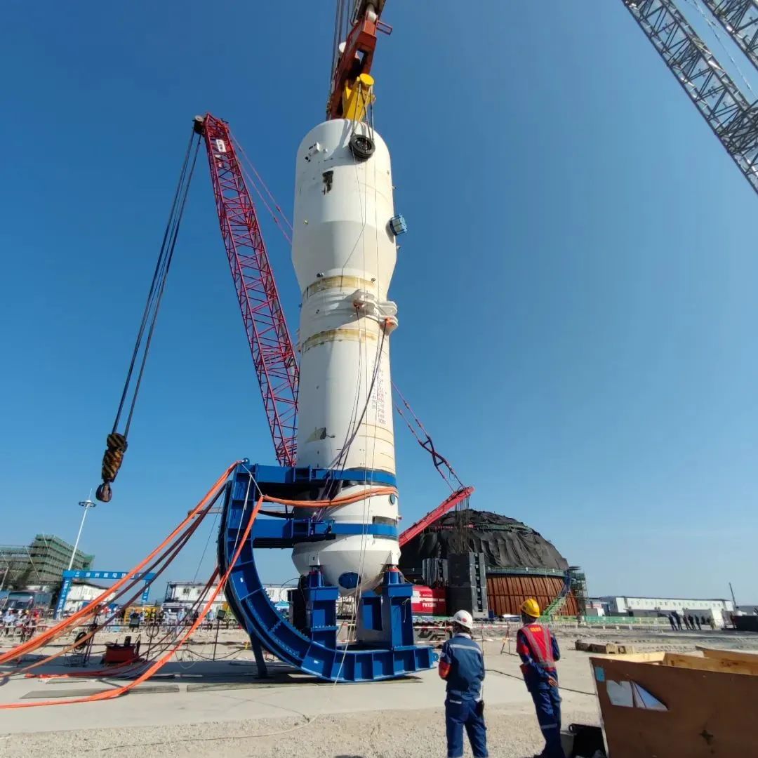 9月26日13時48分,隨著現(xiàn)場總指揮一聲令下,3200噸履帶式大吊車緩緩啟動,漳州核電1號機組首臺蒸汽發(fā)生器(第二環(huán)路)經(jīng)過翻轉(zhuǎn)、提升、變幅等一系列既定工序,于9月27日1時06分順利吊裝就位。整個吊裝過程中所用的吊梁、配套索具、提吊耳軸均由巨力索具提供,為后續(xù)主設(shè)備吊裝奠定了堅實基礎(chǔ),漳州核電項目“主設(shè)備先行引入法”施工贏得“開門紅”。