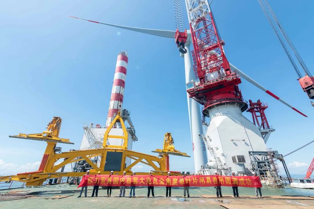 近日,汕頭某海域,巨力索具研發(fā)的國(guó)內(nèi)首臺(tái)50噸大兆瓦全角度旋轉(zhuǎn)式海上單葉片吊具,剛剛面世,便展開連續(xù)作業(yè),順利完成5臺(tái)風(fēng)機(jī)的葉片吊裝,經(jīng)受住了考驗(yàn),完美的展示了巨力吊具的高可靠性、高安全性及高效率。